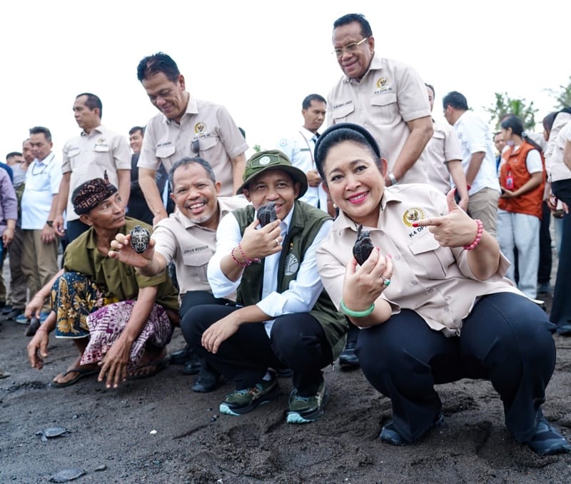 Menteri Kehutanan Raja Juli Antoni bersama Ketua Komisi IV DPR RI Titiek Soeharto melakukan pelepasan 210 tukik (anak penyu) di Pantai Saba, Gianyar, Bali. Pelepasan tukik ini jadi simbol nyata kolaborasi upaya pelestarian ekosistem laut dan satwa dilindungi di Indonesia.