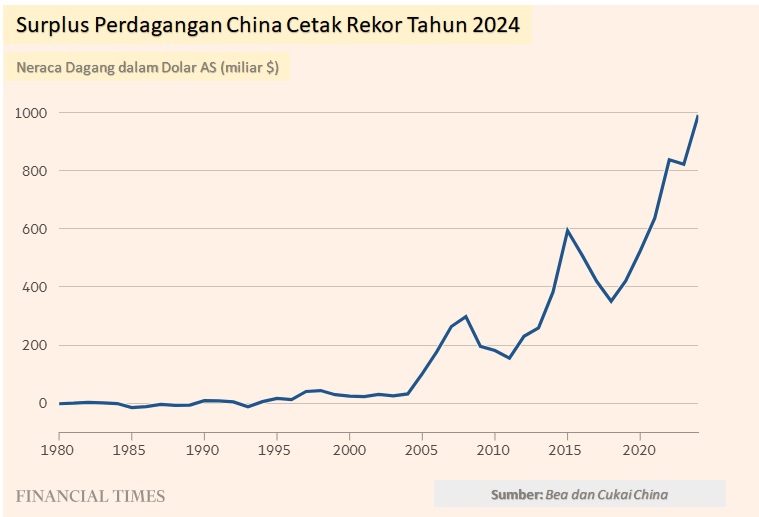 Surplus besar China ini hanya berjarak seminggu sebelum Donald Trump dilantik menjadi Presiden AS untuk masa jabatan kedua. Trump sudah berjanji akan memberlakukan tarif bea masuk hukuman terhadap rival ekonomi terbesar mereka ini.